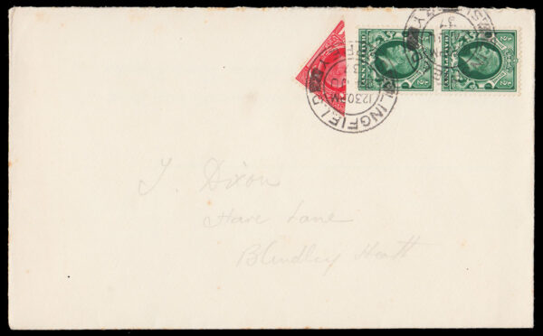 SG439/440 1934 ½d. Green and 1935 1d. Scarlet. “Photogravure”. Pair of the ½d. and a bisected 1d. on envelope sent locally in LINGFIELD…