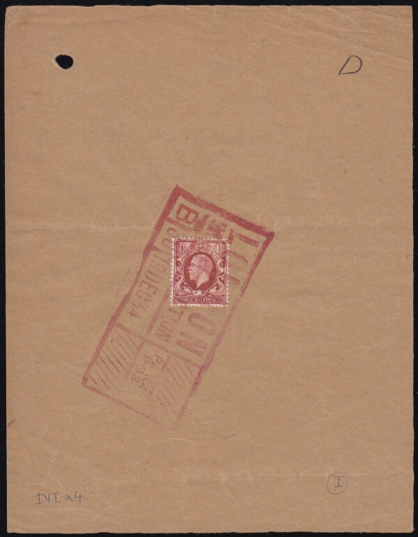 SG441 1934 1½d. on “hard” panel, cancelled with London Parcel Post cancel- a trial.
