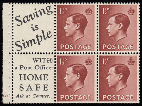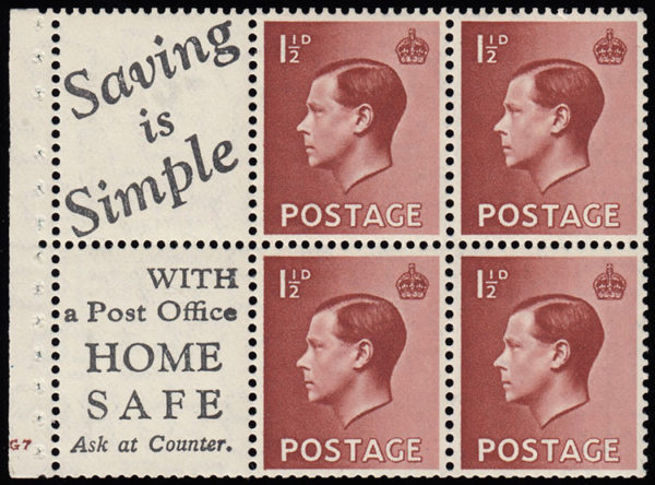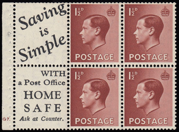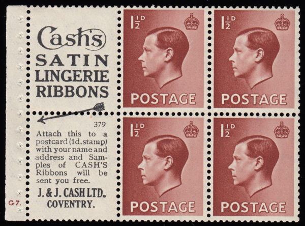 SG459a 1936 Advert pane no.7, cylinder G7 no dot “E” perf. Decent perfs, lightly mounted mint.