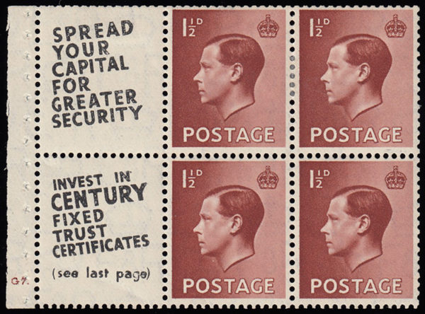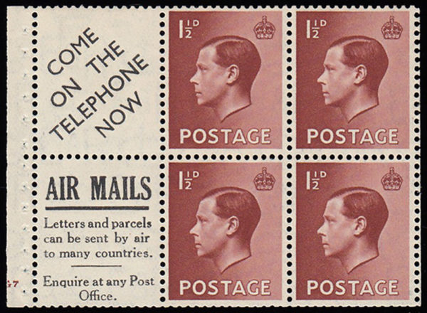 SG459a 1936 1½d. Red-brown, Ad pane no.3, ed. 379.