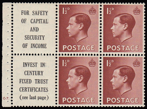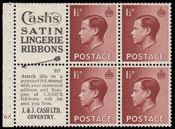 SG459a 1936 1½d. Advert pane no.3, cyl. G7 dot, perf I. Edition 357.