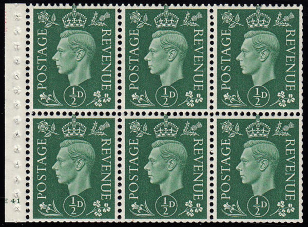 SG462b 1937 ½d. Green cylinder 41, no dot, unmounted pane of 6.