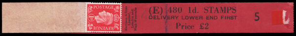 SG463 1937 1d. Scarlet. Coil Leader. . Vertical Delivery Code “E”. One stamp attached. Cat. £45.