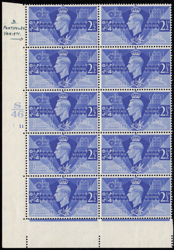 SG491a 1946 Victory 2½d. Ultramarine “Extra port hole aft”. Cyl. 11, no dot, R5/6.