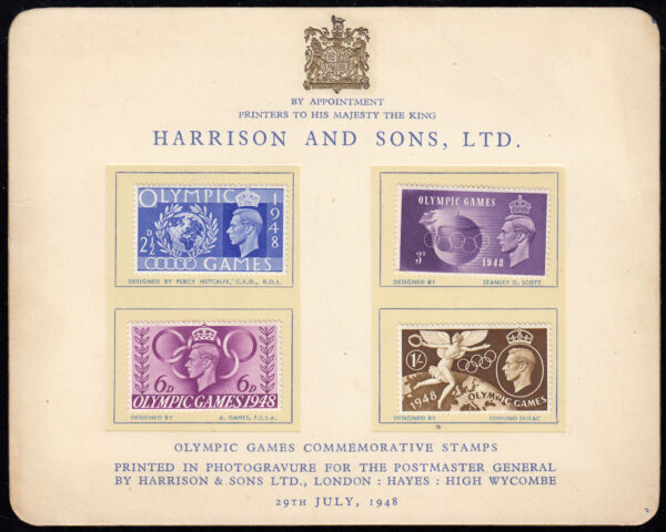 SG495 – SG498 1948 Olympic Games set of 4 on Harrison & Sons Ltd. presentation card.