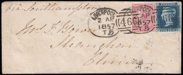 SG66 1857 Neat envelope to Shanghai, via Southampton.