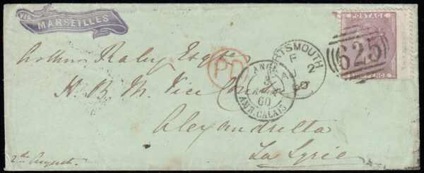 SG68 1860 6d. Lilac on cover to “La Syrie”, neat “625” duplex of Portsmouth.