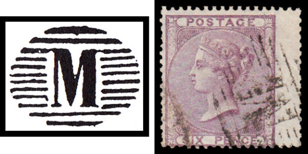 SG68 1856 6d. Lilac Pl.1. Wmk. Emblems. Used Abroad – Malta. Right hand wing marginal cancelled by the “M” in oval of bars.