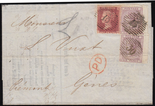 SG68 1859 Printed envelope to Genova, Italy, franked 1/1d.