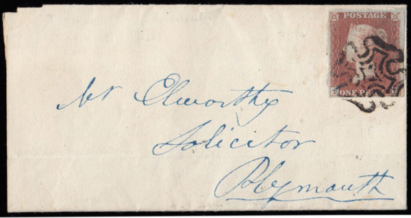 SG7 1841 1d. Red-brown, plate 11, IG. Very fine used on neat entire, Tavistock to Plymouth.