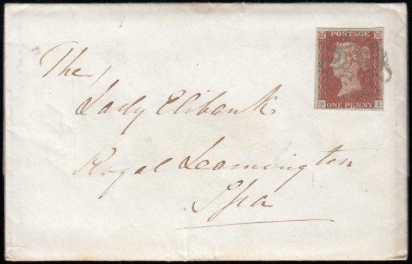 SG7 1841 1d. Red-brown (KD). Three margined example on “Commercial Bank of England, Manchester” entire.