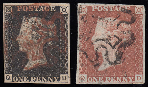 SG2 and SG7 1840 1d. black, plate 1b and 1d. Red, plate 1b, QD, fine used matched pair.