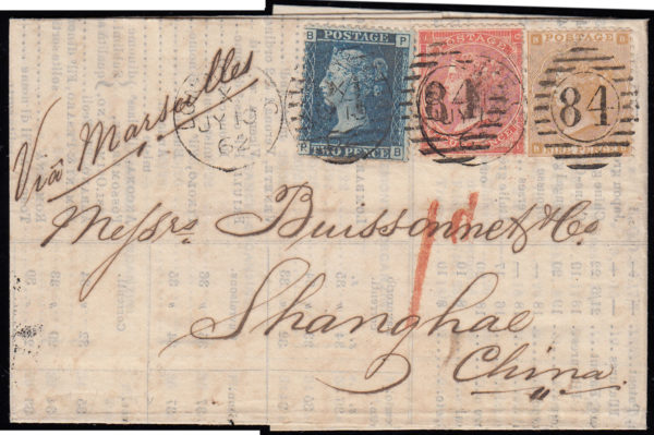 SG86 1862 Entire (prices current), London to Shanghai, China, via Marseilles.