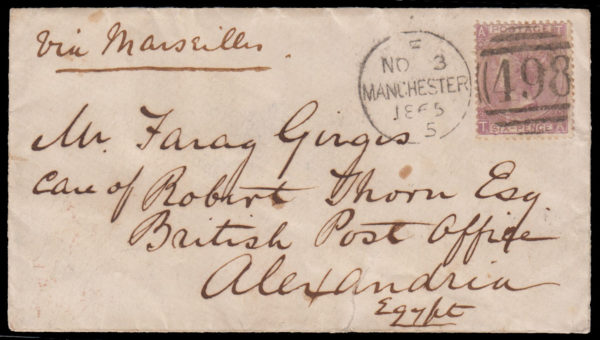 SG96 1865 6d. Deep lilac, plate 6 on entire from Liverpool to Bologna, Italy.