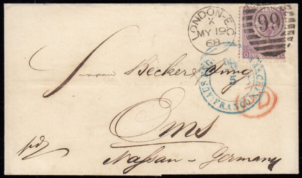 SG96 1868 6d. Deep lilac, plate 6, OC, on neat cover to Germany.