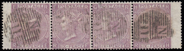 SG97 1867 6d. Deep lilac, RE-RH strip of 4. Excellent colour and fine “N/11” numeral cancel.