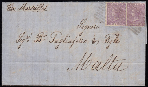 SG97 1868 6d. plate 5, OA-OB pair, Troon to Malta via London.
