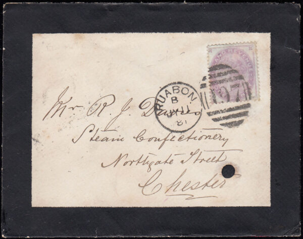 SGF20 1881 1d. Fiscal on mourning envelope from Ruabon, Wrexham.