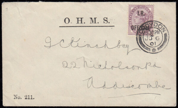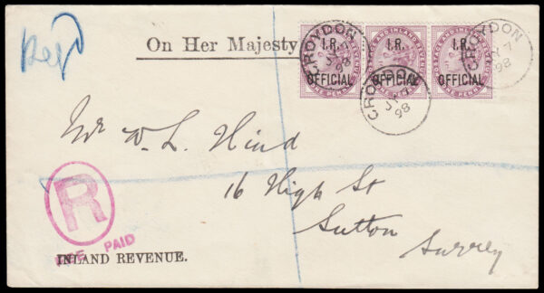 SGO3 1882 1d. Lilac. Die II. “I.R. OFFICIAL”. Envelope from PUTNEY incorrectly addressed to SURREY.