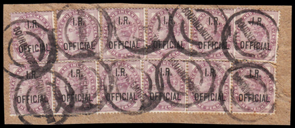 SGO3 1882 1d. Lilac. Die II. “I.R. OFFICIAL”. Ten examples tied to piece by BOURNMOUTH parcel handstamps…