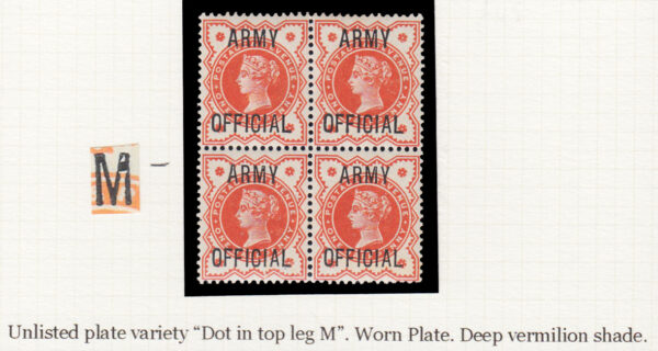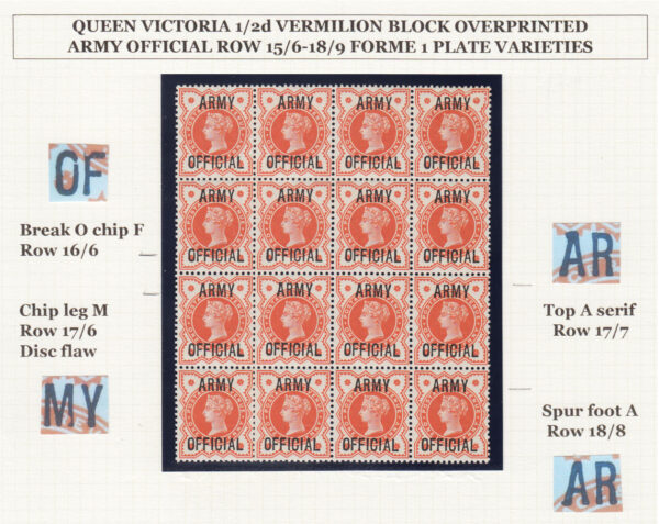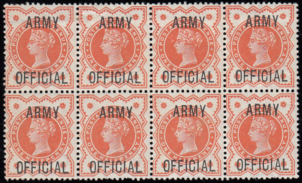 SGO41 1896 ½d. Vermilion. “ARMY OFFICIAL”. Fine unmounted o.g. block 16 with multiple unlisted varieties.
