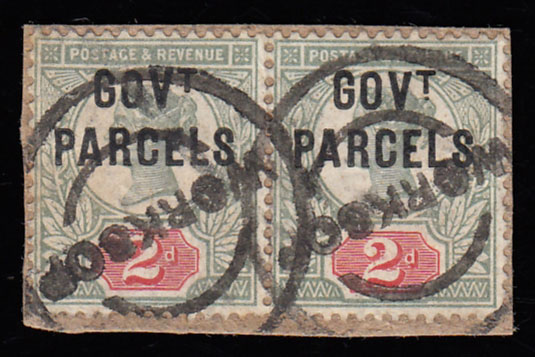 SGO70a 1891 2d. Jubilee GOVT. PARCELS pair on small piece, Worksop parcel cancels with plate variety…