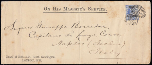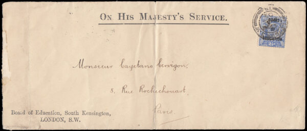 SGO85 1902 2 1/2d. Ultramarine Board of Education on OHMS “Board of Education, South Kensington” envelope.