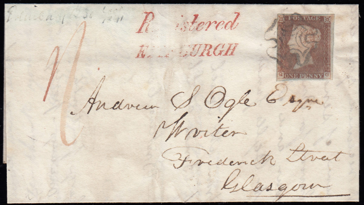 With fine Registered at Edinburgh clearly showing the “tape gap”. 1/- paid in cash. A rare black plate registered cover.