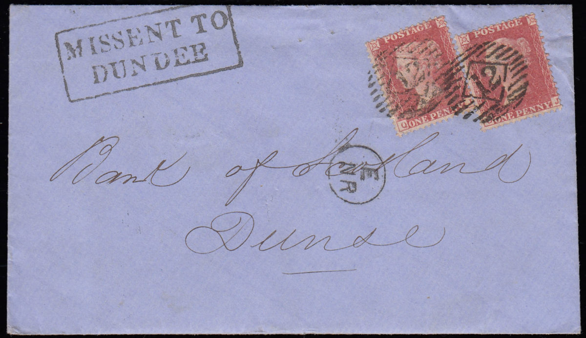 With a superb boxed “Missent to Dundee” and neat Railway cancel “E/NR”. Attractive.