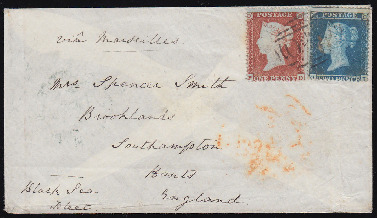 With 2d. Blue SC16, plate 4, plus 1d. perf. 1b, cancelled with the scarce, “OXO” cancel. Backstamped, POST OFFICE/ BRITISH ARMY, dated July 2 1855. Endorsed “Black Sea Fleet” and “via Marseilles”. Attractive despite a vertical bend.