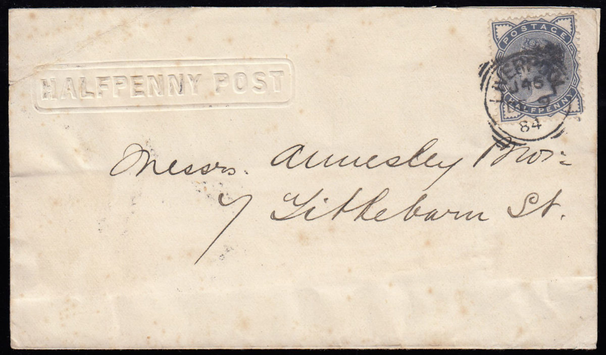 With ½d. Slate blue, used locally in Liverpool. Neat squared circle, dated DE.9.84. Unusual and scarce.