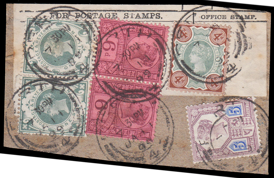1887 4d. Green and Purple-brown “Jubilee” 1888 5d. Dull Purple and Blue “Jubilee”. Die II, 1887 6d. Purple on Rose-red “Jubilee” (x2) and 1s. Dull Green “Jubilee” (x2). Parcel Post Label. Perth. Cut-down label attached to piece with each stamp cancelled by c.d.s. for JA. 11. 99.